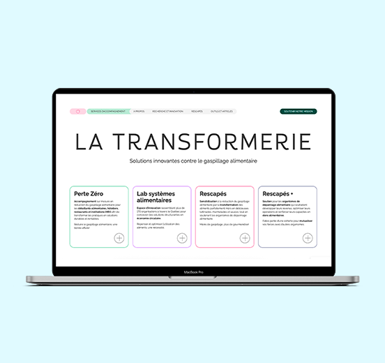 Nous avons réalisé la refonte du site Web de La Transformerie afin de mettre en valeur sa mission de réduire le gaspillage alimentaire et de transformer les systèmes alimentaires vers plus de résilience et de circularité. Le site, développé sur mesure avec WordPress, présente clairement leurs trois volets d’action : la gamme de produits « Rescapés » issus de fruits et légumes invendus, le programme « Perte Zéro » pour accompagner les commerces et institutions dans la réduction des pertes, ainsi que le « Lab systèmes alimentaires » favorisant la collaboration entre acteurs du milieu. L’architecture et le design ont été pensés pour transmettre l’impact concret de l’organisme, faciliter l’accès à l’information et encourager l’engagement du public et des partenaires.