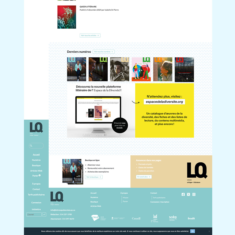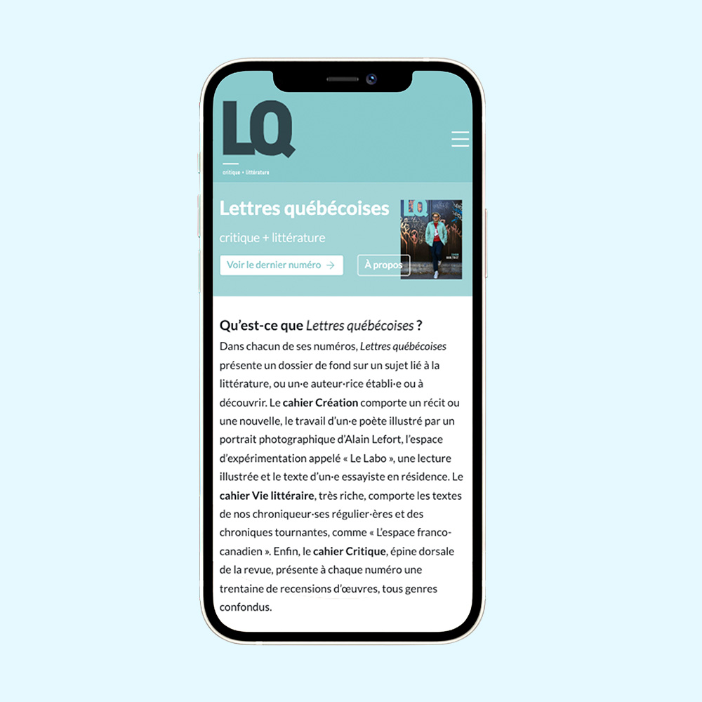 Nous avons été mandatés pour refondre le site web de Lettres québécoises, en collaboration avec Trois, quat’ studio créatif. Ce WordPress sur mesure intègre un plugin permettant au client de publier directement ses fichiers InDesign en ligne. Le site comprend également des espaces dédiés aux publicités HTML, une boutique en ligne, ainsi qu’un espace client offrant des abonnements numériques adaptés aux lecteurs. Il est également possible pour le client de modifier les couleurs du site Web selon le nouveau numéro publié.