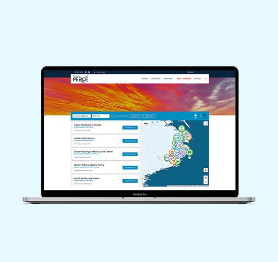 Le nouveau site Web de Tourisme Percé a été fait à partir d’un gabarit WordPress. Par la suite a été ajoutée une carte interactive sous forme de répertoire pour aider les visiteurs à trouver où dormir, où manger et quoi visiter durant leur séjour. Chaque élément du répertoire possède une fiche détaillée.